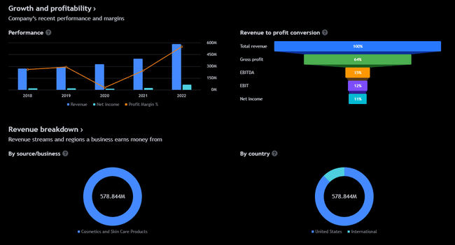 Las acciones cotizan actualmente en su nivel más alto en 52 semanas, con una capitalización bursátil de 6.000 millones de dólares. La relación precio/beneficios (PER) a futuro es de aproximadamente 63. En comparación, otras empresas de cosméticos que venden productos en Internet y en tiendas minoristas, como L'Oréal y Estée Lauder, cotizan a múltiplos de 34 y 37, respectivamente.