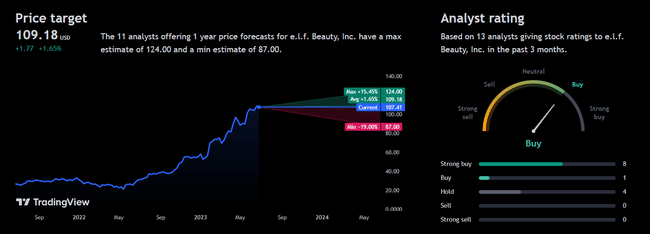 A finales de mayo, se publicaron los beneficios de $ELF para el año fiscal 2023, que terminó el 31 de marzo, y fueron muy impresionantes. Para el año fiscal 2023, e.l.f. aumentó sus ventas netas en un 48% a 579 millones de dólares y aumentó su margen bruto al 67%, más de 3 puntos porcentuales año tras año. La empresa atribuyó el aumento de los ingresos y el margen a la fuerte demanda en el comercio minorista, en línea y a los precios.