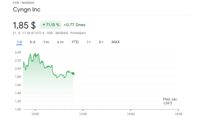 Cyngn$CYN desarrolla vehículos totalmente autónomos y autosuficientes y otros carros diversos. Las acciones de Cyngn $CYN se han disparado hoy después de que el desarrollador de software de conducción autónoma haya presentado un nuevo producto. Es un acontecimiento importante que ha disparado el precio de las acciones un 77%.