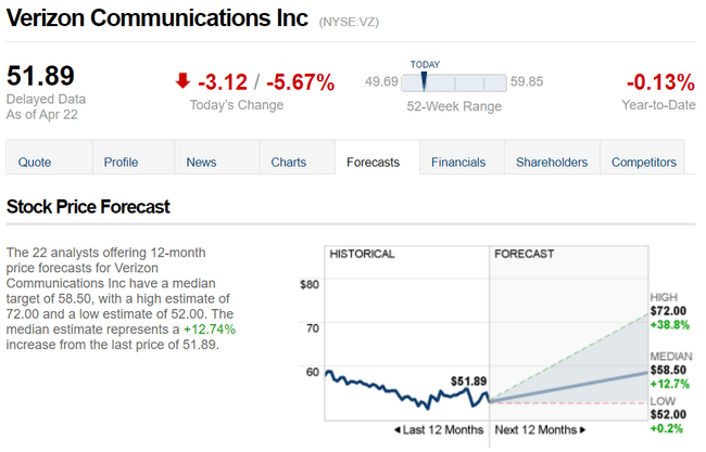 Verizon Communications $VZ cayó el viernes después de que el gigante de las telecomunicaciones rebajara sus expectativas de beneficios para 2022. Las acciones de Verizon cayeron más de un 5% justo después de la campana de apertura.