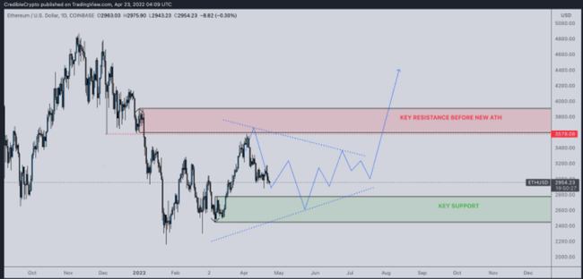 Actualmente, el bitcoin vale alrededor de 39.500 dólares. Tiene una opinión similar sobre Ethereum, que cree que caerá en algún punto hacia el soporte de 2.500-2.800 dólares antes de que la tendencia cambie hacia el crecimiento.