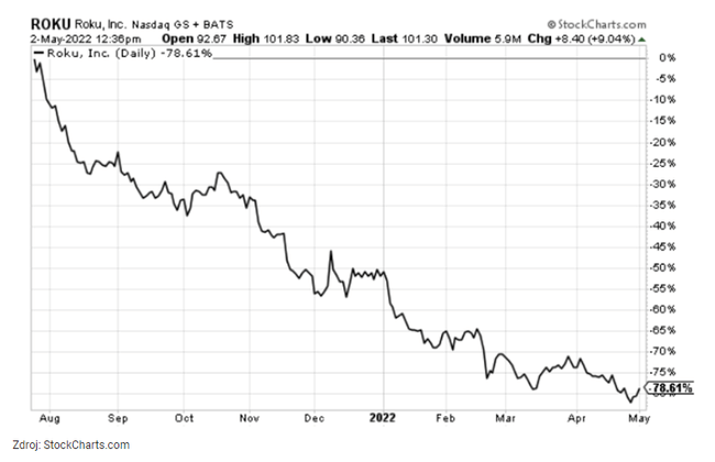 A continuación puedes ver que Roku ha perdido el 79% de su valor desde el pasado mes de julio.