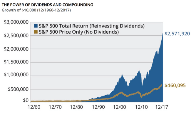 Supongamos que su horizonte de inversión es de +-40 años. Históricamente (con un horizonte de inversión a largo plazo), los ingresos por reinversión de dividendos equivalen a la gran mayoría de los rendimientos acumulados de la cartera de muchos valores estadounidenses.