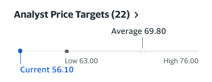 Como podemos ver, 22 analistas de Wall Street han fijado el precio medio en 70 dólares, lo que supone un buen aumento respecto al precio actual de 56 dólares. También definieron el estatus de BUY.
