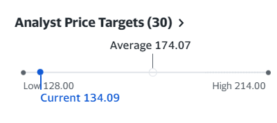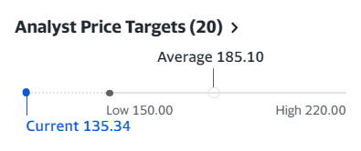 Como podemos ver, basándonos en una previsión de 20 analistas de Wall Street, la mediana del precio de esta empresa es de 185 dólares, lo que supone un sólido aumento respecto al precio actual de 135 dólares. Además, los analistas se han posicionado con una calificación de COMPRA.