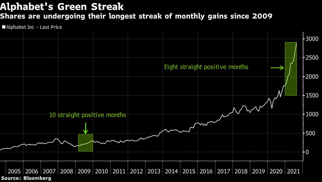 Las acciones de $GOOG están disfrutando de un éxito similar, como se puede ver maravillosamente en el siguiente gráfico de Bloomberg: