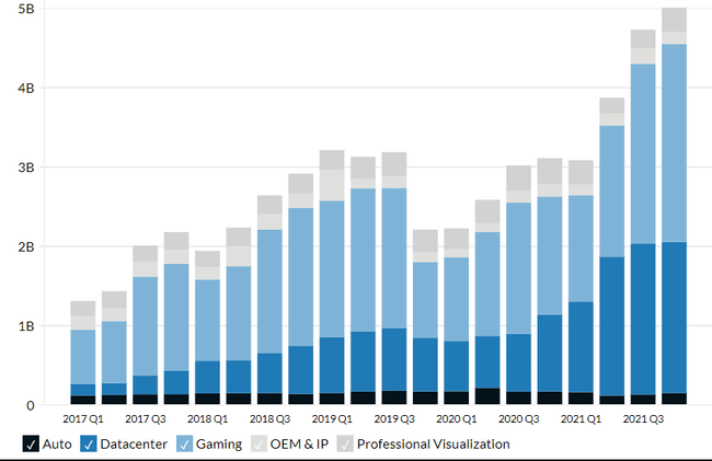 De sus 7.100 millones de dólares de ingresos en el último trimestre, más de 2.900 millones procedieron de ventas a propietarios de centros de datos, lo que supone un aumento del 55% respecto al año anterior. Aunque esta cifra sigue siendo ligeramente inferior a los ingresos de los juegos, que superan los 3.200 millones de dólares en el mismo periodo de tres meses, los ingresos de los centros de datos están creciendo mucho más rápido. Pronto se convertirán en una parte cada vez mayor del negocio.