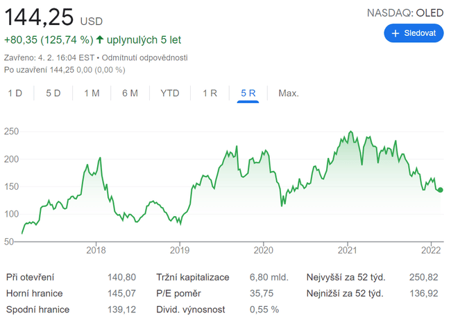 El ticker $OLED de Universal Display puede dar una pista sobre su enfoque de negocio: pantallas para dispositivos electrónicos como smartphones, televisores, tabletas y smartwatches. Su especialidad es la tecnología de diodos orgánicos emisores de luz (OLED) de bajo consumo, y sus pantallas pueden encontrarse en la línea Galaxy de Samsung y los televisores OLED de LG, entre otros.