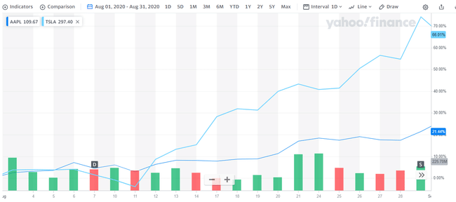 Rendimiento de Apple y Tesla en la división de acciones, fuente: Yahoo Finanzas