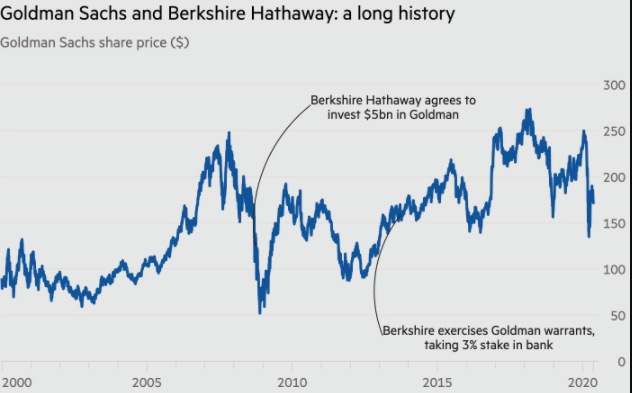 Buffett fue especialmente hábil durante la debacle del crédito. Sus compras incluyeron la adquisición de 5.000 millones de dólares en acciones preferentes perpetuas de Goldman Sachs $GS, que le pagaban un 10% de interés e incluían garantías para comprar más acciones de Goldman.